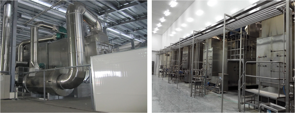 而對于臥式干燥機,對物料的霧化、熱風脫水干燥、低速循環(huán)刮板粉末輸送、排風布袋除塵、出粉等一系列工藝過程都在同一個緊湊的干燥箱體內(nèi)連續(xù)完成,使得設(shè)備占地面積小,而高度,比如對于1900公斤/小時的臥式干燥機點只有12米。另外,對于設(shè)備內(nèi)部清洗,在臥式干燥機箱體內(nèi)工作是安全和容易的,只需要一臺高壓清洗機,工人站立著輕松操作;而在巨大的立式干燥塔內(nèi)部清洗,距地面十多米甚至更高,安全性和難易程度是顯而易見的。