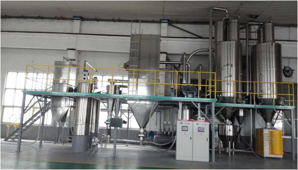 對于立式干燥機,由于垂直向下噴霧以形成霧滴的設(shè)計而導致干燥機塔體高度很高,也由于立式干燥機使用風(氣流)輸送粉末而必須設(shè)計使用分體的旋風分離器和布袋除塵器,這就導致立式干燥機占地面積很大,從而也要求立式干燥機的廠房高度要高、面積要大。另外,立式干燥機的粉末出料口多(塔底、旋風分離器、布袋除塵器等2-3處),同時只有細粉末才能到達的布袋除塵器,所以不同出粉口瀉出的粉末含水量和顆粒度事實上是不同的!